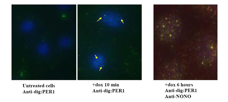 - Figure 7. RNA FISH showing the induction of Per1 gene expression and the colocalization of NONO protein with Per1 RNA. After 10 minutes, transcription of both Per1 genomic loci (green) can be seen in about 1/3 of all cells. Later, many PER1 nuclear foci are visible, and some colocalize with the NONO protein (red). METHODS: 3T3 fibroblasts were treated with dexamethasone, then incubated in medium without dexamethasone for the indicated times before fixation. RNA FISH was performed using digoxygenin-labeled PER1 probe. This probe was subsequently detected with three sequential rounds of antibody detection as described in Gribnau et al., 1998. The final antibody was coupled to Alexa488 fluorophore for visualization by fluorescence microscopy. In the right panel, part of a different experiment, an anti-NONO antibody was also included and detected with Alexa546 fluorophore-coupled secondary antibody. All cells were also stained with DAPI, and images shown are computer-generated merges of separate images in each pertinent wavelength.
