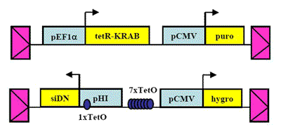 - Figure 5. To achieve tet-inducible knockdown of the target gene, two lentiviruses are used. One expresses the Tet repressor fused to the KRAB repression domain. The other contains a histone H1 promoter siRNA cassette. Into this cassette, Tet operator elements have been introduced upstream of the promoter and between the TATA and start site. Each virus contains a separate antibiotic resistance marker. After infection, individual clones are tested for levels of expression and induction. These virues are derivatives of those described in Wiznerowicz and Trono, 2003.