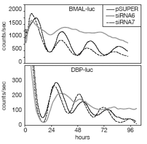 - Figure 6. 3T3 cells were transfected with circadian reporter-luciferase fusion vectors, as well as with the pSUPER siRNA hairpin expression vector containing either no insert or the siRNA6 or siRNA7 Nono-specific hairpins. After synchronization of circadian rhythms with dexamethasone, BMAL1-luciferase (top) and DBP-luciferase (bottom) levels were measured by continuous live-cell luminometry.