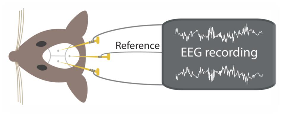 Figure 1: Basic setup for EEG recording in Mice. Two parietal EEG electrodes (2mm anterior to lambda and 2mm laterale to the midline) are referenced to an electrode over the cerebellum. Additionally, EMG (electro-muscle-gram) is recorded simultaneously (not shown here). The raw signal is pre-amplified (factor 2000) and filtered (High-pass filter: -3dB at 0.016Hz, Low-pass filter: -3dB at 40Hz) and stored with a resolution of 128Hz.
